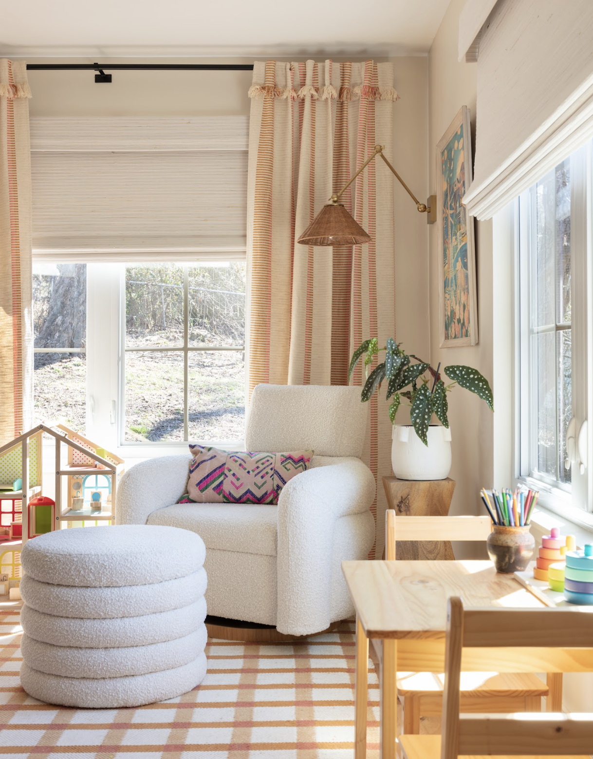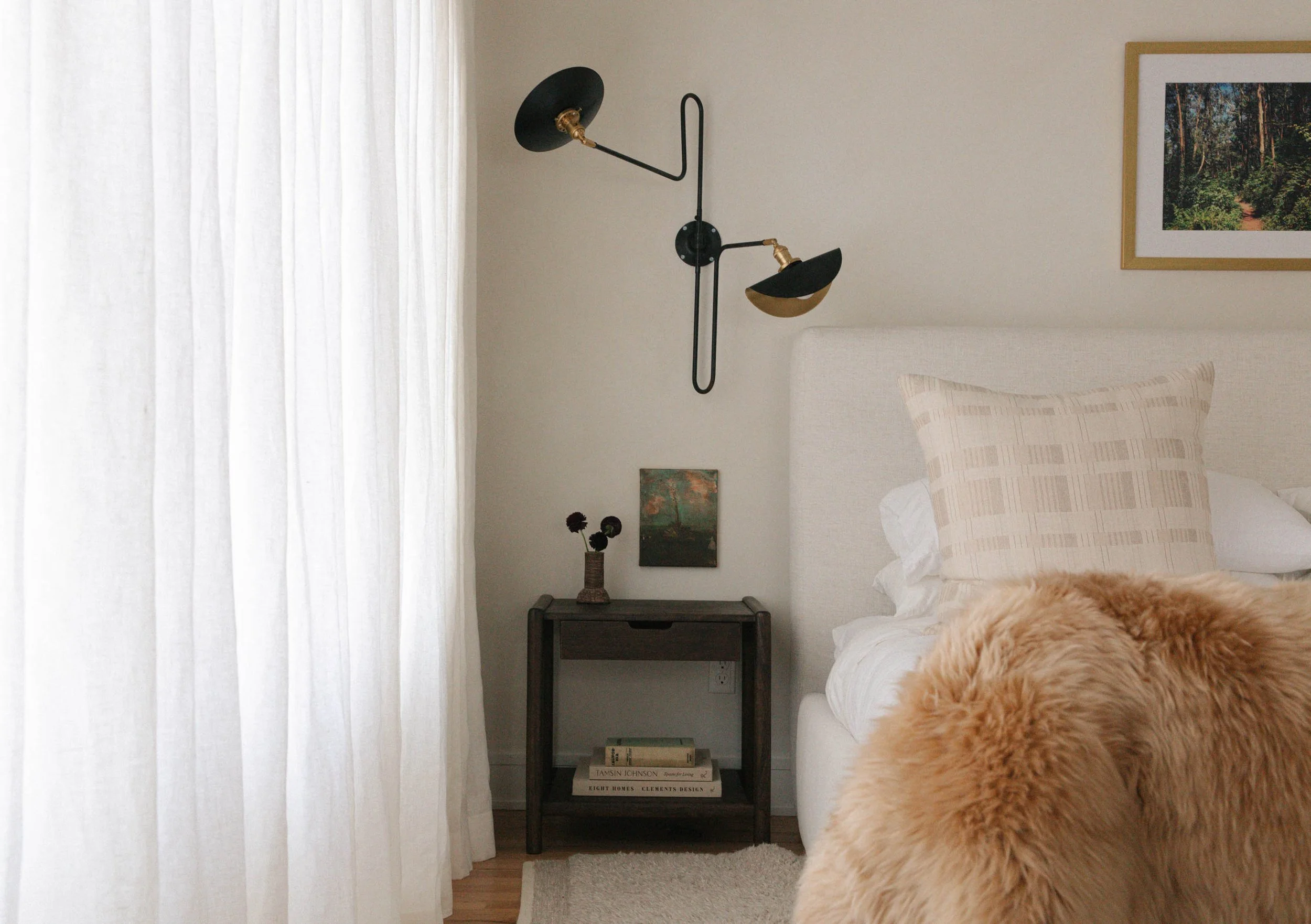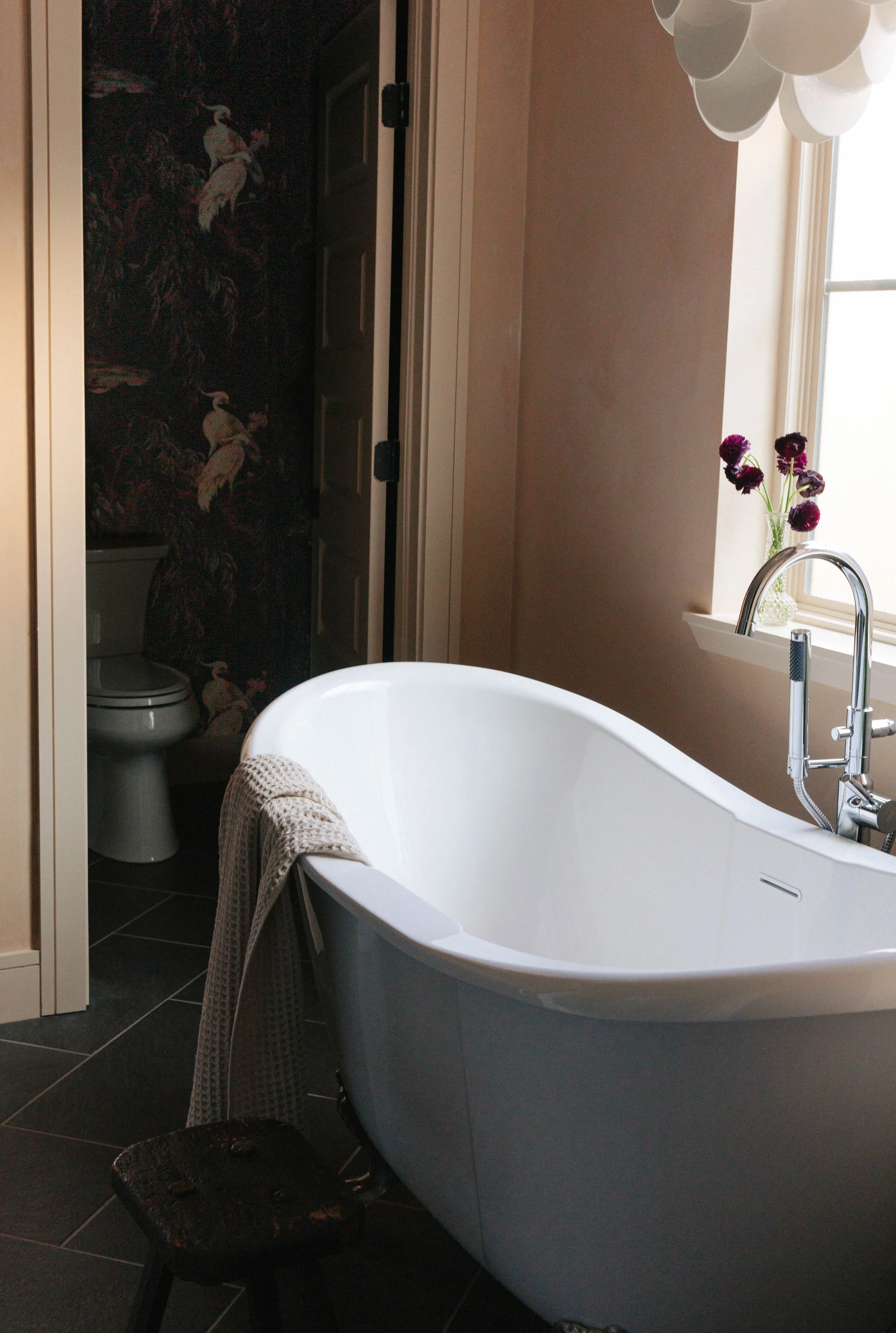 We dialed up the organic, textural mood in the primary suite by covering the walls with a limewash paint to give them a plaster-like finish. Curves in the lighting—both the funky bedside sconces and undulating piece overhead—bring movement to the space. We deepened the plaster tone in the primary bathroom with a blush color that draws out the taupey neutral tone from the House of Hackney wallpaper adding a surprise pattern in the toilet room.
