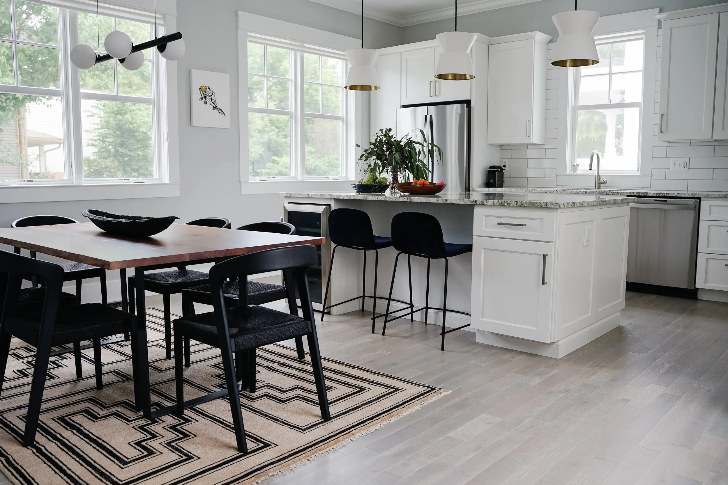 Our goal was to create a modern design refresh in the dining room and kitchen for our clients without having to paint or remodel. We replaced all lighting with a mid-century inspired shapes and added in funky art, rugs, and chairs to create a surprising spin on a traditional home.